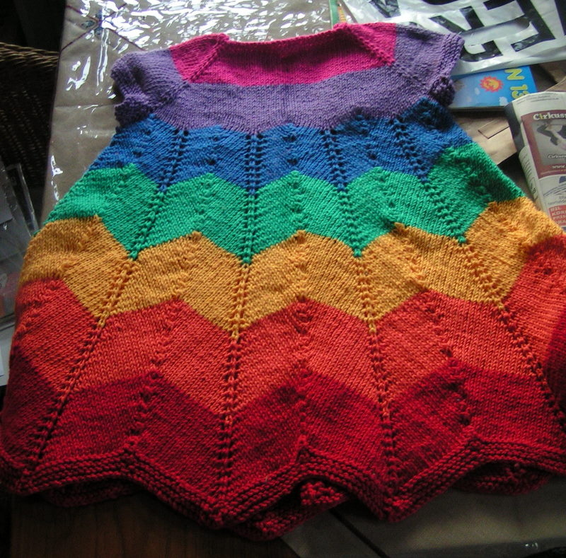 Denne her var sådan set færdig, men da Anna (min grandniece) skulle have den på, kunne hun ikke få den over hovedet, så nu er der strikket en løsere halskant på.